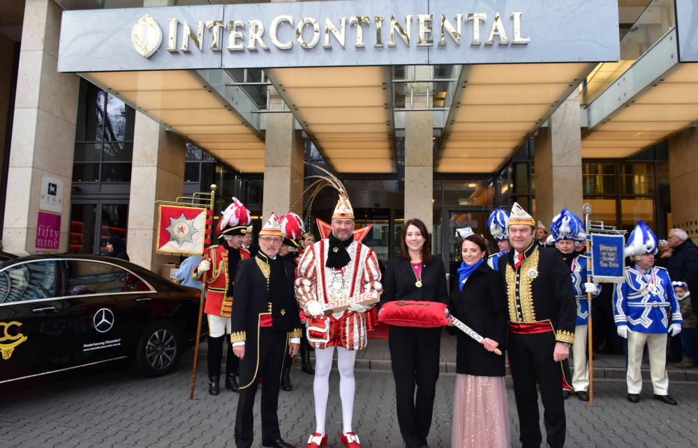 Die zahlreichen Passanten auf der Kö staunten nicht schlecht, als sie das Prinzenpaar der Landeshauptstadt Düsseldorf mit seinen Leibgarden und Fanfarenzügen am Samstag auf der Prachtallee erblickten. Ziel des auf dem Schadowplatz gestarteten Fußmarsches war das Hotel InterContinental - bis zum Ende der Session die Hofburg der Tollitäten. Empfangen wurden Prinz Carsten II. und Venetia Yvonne vor dem Portal von Hotelchefin Britta Kutz, die ihren Gästen auf einem roten Samtkissen symbolisch den Schlüssel ihrer Residenz überreichte. Bei einem anschließenden Empfang im Foyer, an dem auch Vertreter des CC-Vorstandes teilnahmen, betonte die Hoteldirektorin, sie sei mit dem gesamten Team sehr stolz, als internationales Hotel an den Traditionen der Stadt teilhaben zu können: „Und das bereits zum zweiten Mal als Hofburg des Prinzenpaares. Wir sind froh, dass der Düsseldorfer Karneval nicht nur vor, sondern auch hinter unserer Hoteltür stattfindet.“ Neben CC-Präsident Michael Laumen nutzten auch Prinz Carsten II. und Venetia Yvonne die Gelegenheit, um der Hotelchefin für die großzügige Unterstützung zu danken. Das Prinzenpaar machte keinen Hehl daraus, dass es sich sehr darauf freue, ein paar erholsame Tage und Wochenenden „in diesem modernen Schloss“ zu verbringen. Während die Leibgarden im Foyer mit frisch gezapftem Altbier und Erfrischungsgetränken verwöhnt wurden, durften Prinz und Venetia ihre Luxussuiten im neunten Stock des Hotels besichtigen und den atemberaubenden Blick über die Dächer der Stadt genießen. Kredenzt wurden dazu zwei extra gemixte Cocktails in den Farben der Leibgarden: Ein Blue Curacao mit Champagner und Sahne sowie ein roter Himbeer-Daiquiri auf Eis.