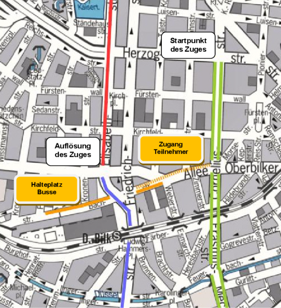 - NEU: Die Anfahrt zum Halteplatz für Busse zum Rosenmontagszug ist ausschließlich über die Bilker Allee (von der Gladbacher Str. herkommend) ab 10.30 Uhr möglich. ACHTUNG: Die Zufahrt über die Elisabethstraße, von der Kniebrücke kommend, ist nicht mehr möglich! Im Bereich Elisabethstr. / Ecke Bilker Allee befindet sich eine Schleuse, wo die Busse entsprechend eingewiesen werden. Dort bekommen die Busse Halteplätze zugewiesen. Diese befinden sich auf der Bachstr. (zwischen Elisabethstr. und Palmenstr.). Ab hier müssen ihre Fahrgäste den restlichen Weg zu Fuß absolvieren.