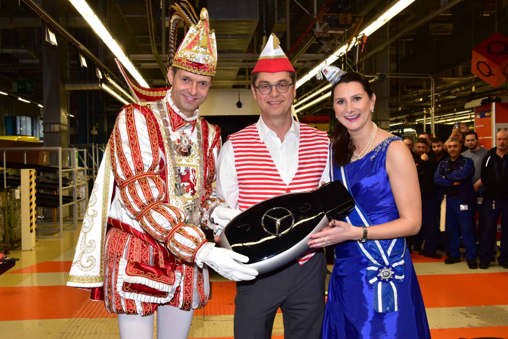 Prinz Martin I. und Venetia Sabine dankten ebenso wie CC-Geschäftsführer Tüllmann für die großzügige Unterstützung, die heutzutage keineswegs selbstverständlich sei. Außerdem stelle das Mercedes-Benz Werk nicht nur Fahrzeuge zur Verfügung, sondern beweise auch viel Herzblut für den Düsseldorfer Karneval. Beendet wurde der Besuch im Mercedes-Benz Werk mit der Verleihung zahlreicher Orden und den gegenseitigen Wünschen für einen tollen Sessionshöhepunkt.