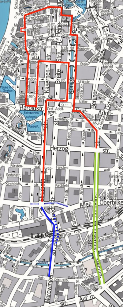 komplette Aufstellstrecke (Mecumstr./Erasmusstr./Corneliusstr.) zwischen „Auf’m Hennekamp“ und Herzogstr. und Zufahrten im Nahbereich, folgend der komplette Zugweg